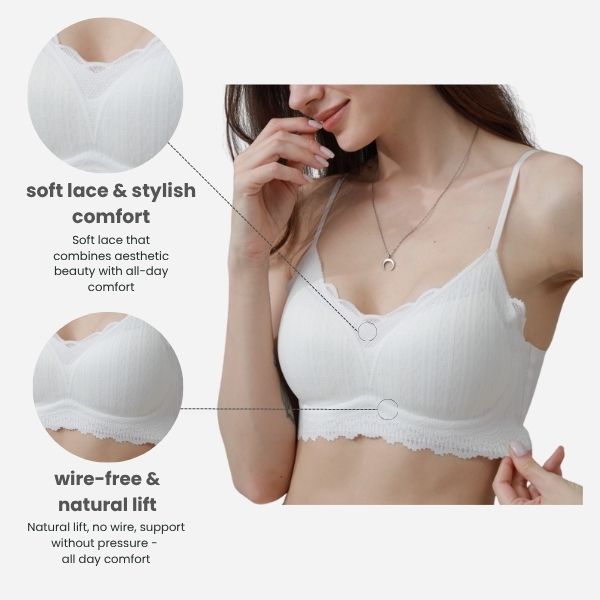 하루 종일 편안하게! 섬세한 레이스와 심리스 디자인으로 하루 종일 편안한 착용감을 선사하는 무선 브라. 옷 안에 착용해도 눈에 띄지 않아 바쁜 일상에도 안성맞춤입니다. #무선편안함 #데일리브라